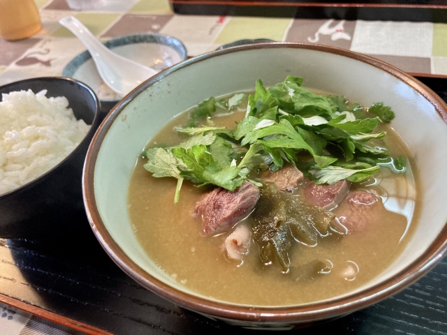宮古島のローカルグルメとして外せないのが「ヤギ汁」です。ヤギの肉を骨ごとじっくり煮込んだ栄養豊富なスープで、祝いの席から日常の食卓まで幅広く親しまれています。
